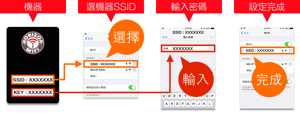 手機與Wi-Fi分享器的連接是非常簡單操作。 如下圖所示,從手機Wi-Fi網路找到分享器的名稱(ID),然後輸入密碼即可完成。 分享器名稱(ID)及密碼均可在機器的背面找到。
